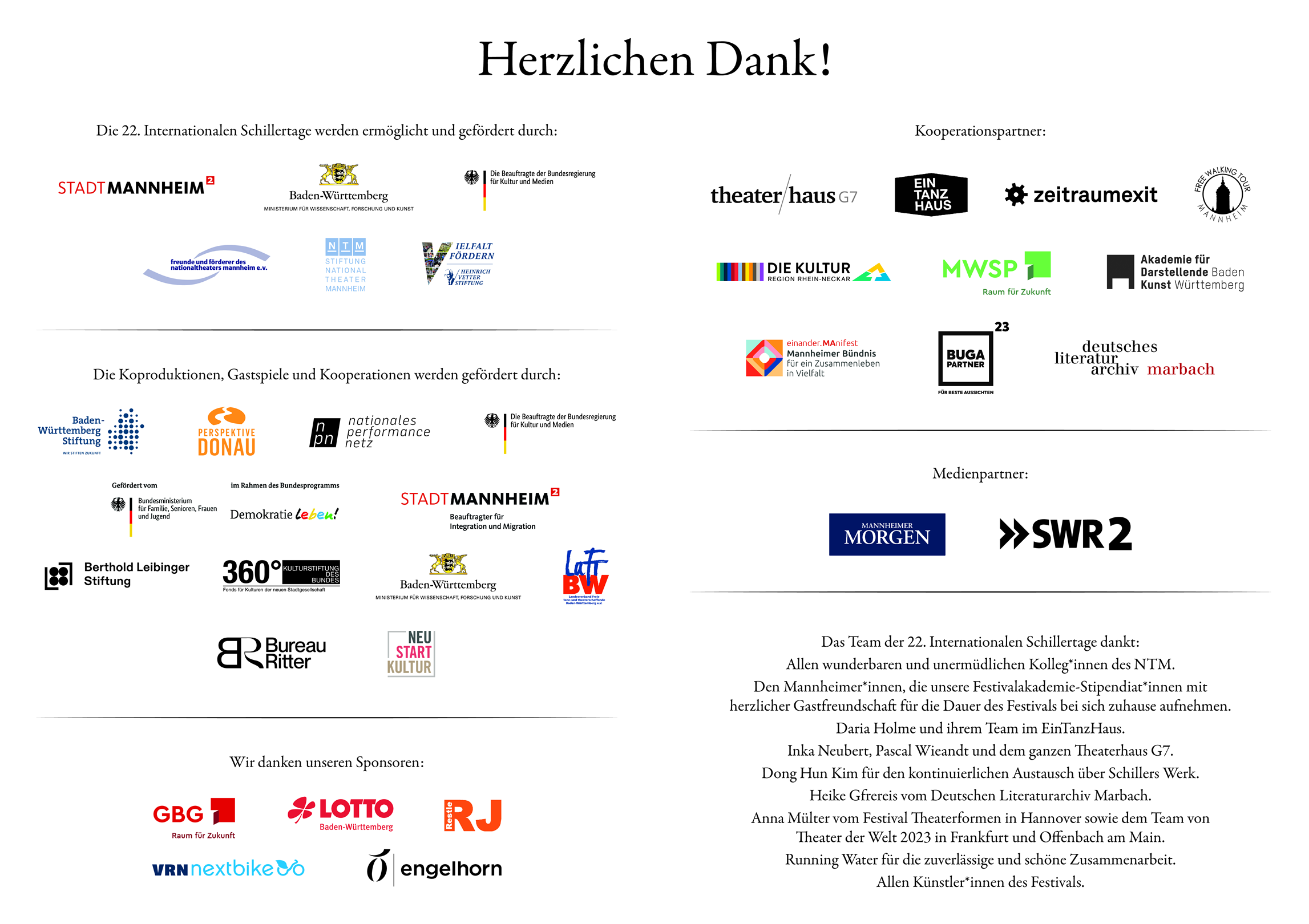 Eröffnet werden die 22. Internationalen Schillertage mit einer neuen Inszenierung von Schillers Freiheitsdrama »Wilhelm Tell« auf der Seebühne im Luisenpark in der Regie von Christian Weise, die in Zusammenarbeit mit der BUGA 2023 entsteht. Neben der Seebühne wird die neue Wirkungsstätte des Schauspiels, das Alte Kino Franklin, der zentrale Festivalstandort sein. Von hier aus begeben wir uns auf die Suche nach der »schönen Welt«, hier wollen wir gemeinsam Schiller, die Zukunft, das Theater und das Leben feiern.