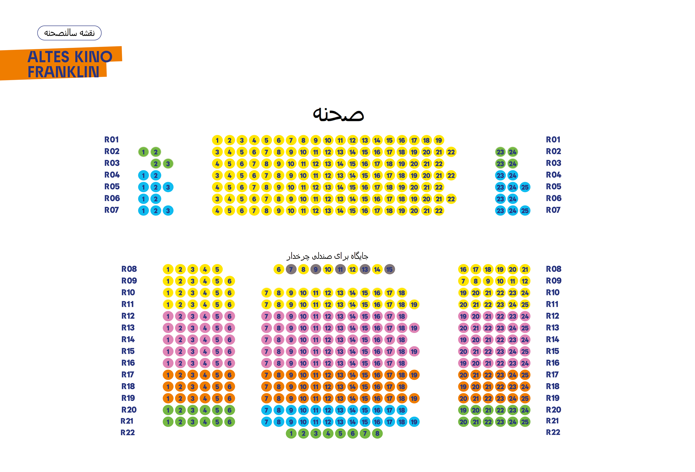 در سالنها و مکان های ما شامل سینمای قدیمی فرانکلین، اپرای لوئیزنپارک (OPAL) و تئاتر قلعه شوِتسینگن Schlosstheater Schwetzingen، میتوانید بر اساس ترجیح، بودجه و در دسترس بودن، از بین پنج گروه قیمتی مختلف انتخاب کنید (برای مشاهده گروههای قیمتی، به نقشههای سالن مراجعه فرمایید).