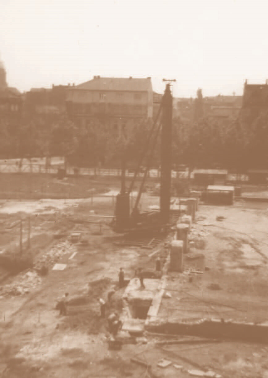 Das Bild zeigt, wie die ersten Pfähle in den Boden gerammt wurden. In regelmäßigen Abständen habe alles vibriert und gewackelt. Am 18. Juni 1954 legte der damalige amtierende Oberbürgermeister Hermann Heimerich den Grundstein für das Gebäude. Kurz darauf dürfte jeder mitbekommen haben, dass die Bauarbeiten am Goetheplatz begonnen haben: »Der Lärm der aktuellen Bauarbeiten ist nichts im Vergleich zu dem, während des Baus des Nationaltheaters«, erinnert sich unsere Anwohnerin.