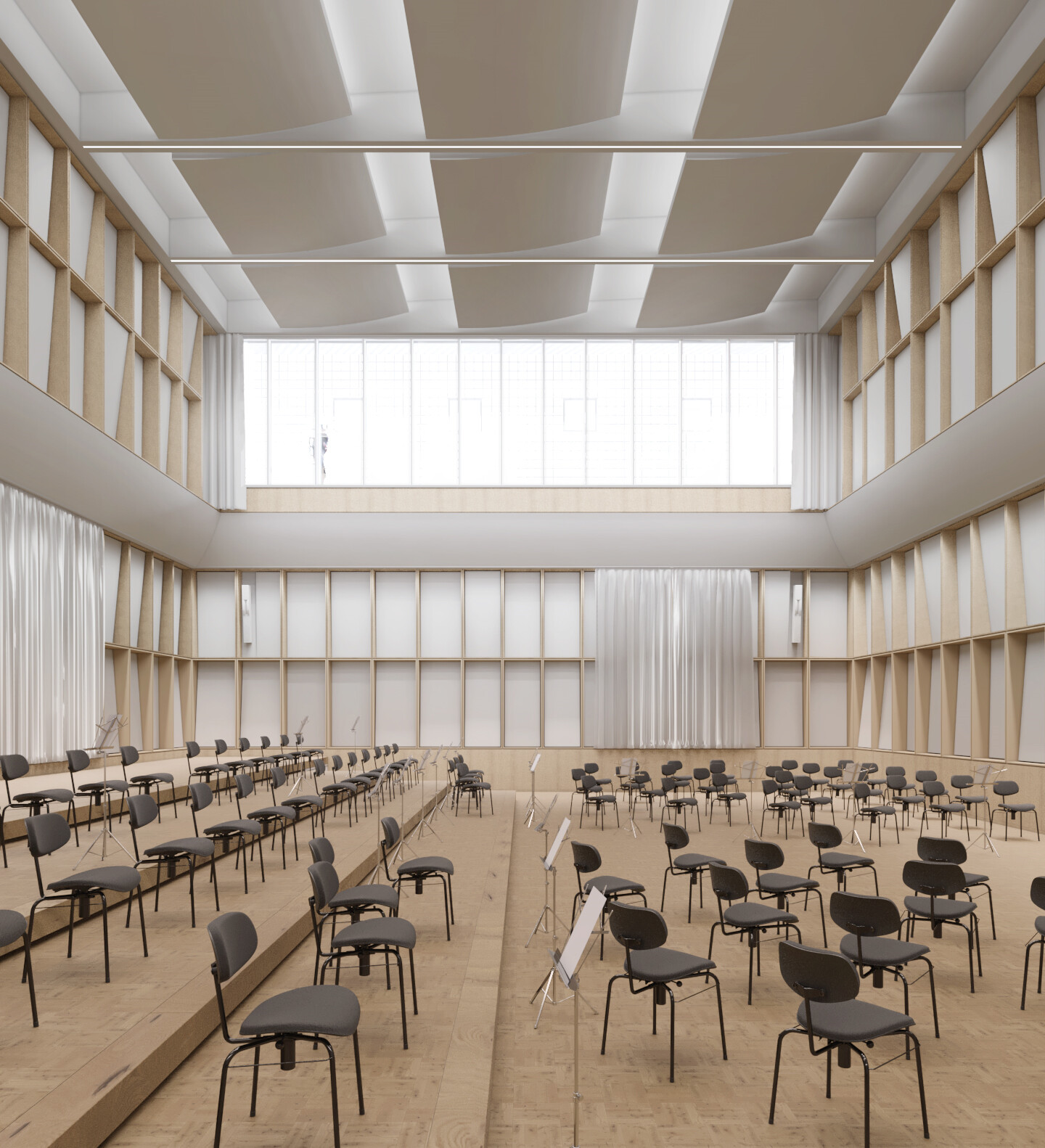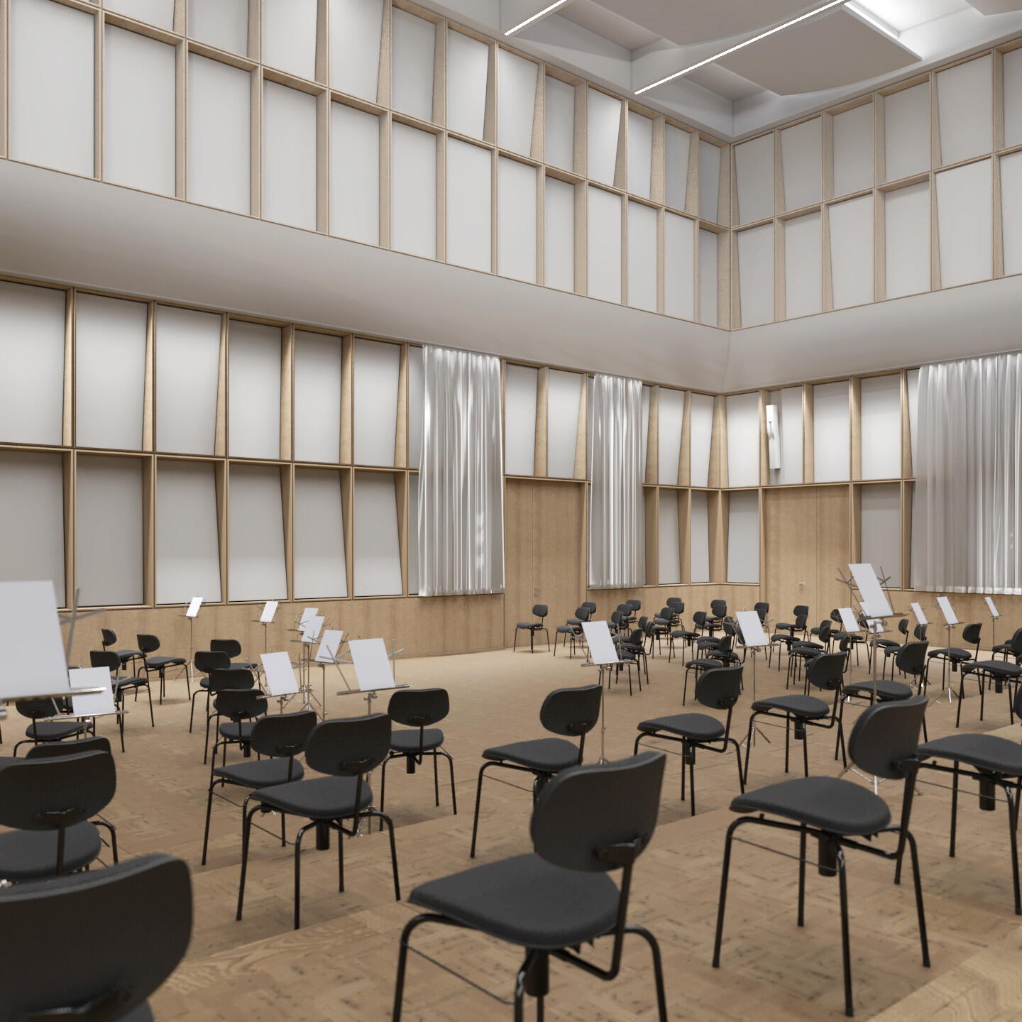 Wir arbeiten mit einem Spezialakustiker zusammen, der die Räume so gestaltet und ausstattet, dass Lautstärke und Schalldruck zum Schutz der Musiker*innen den rechtlichen Vorgaben entsprechen und gleichzeitig die beste Akustik herrscht. Die neuen Proberäume und das Instrumentenlager werden klimatisiert und belüftet, sodass die Luftfeuchtigkeit reguliert werden kann, um beispielsweise die Instrumente zu schonen. Außerdem wird es flächendeckend Brandmelde- und Sprinkleranlagen für den Brandschutz geben.