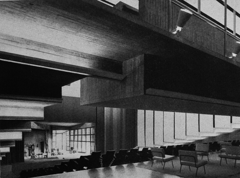 Diese Fensterfront war sinnfälliges Zeichen der vom Architekten angestrebten Offenheit und Durchlässigkeit, der Auflösung des Gegensatzes zwischen Kunst und Leben, zwischen Theater und Stadtgesellschaft. Aufgrund des chronischen Platzmangels wurde das ehemalige Schauspielfoyer zu einem Lagerraum für Technik und Bühnenbildelemente umfunktioniert.