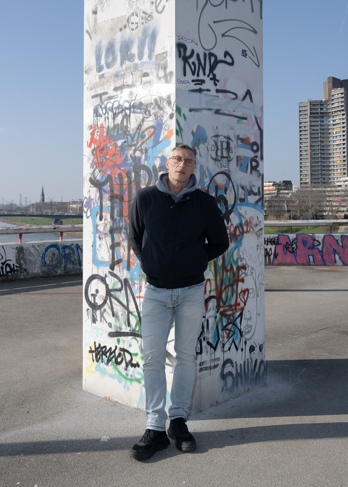»Eine Brücke ist ein schönes Sinnbild. Der Fluss. Mannheim, deine Sonnenuntergänge.«, sagt Uwe Topmann zu dem Ort, an dem er sich für dieses Magazin fotografieren lässt. Wenn man ihn nach seinem Bezug zur Stadt fragt, nennt er als erstes seinen Sohn, der hiergeboren ist, seine Frau und dann das Junge NTM. »Ich bin sehr davon überzeugt, dass wir wichtige Arbeit leisten für die Erfahrungswelt der jungen Menschen, die uns besuchen. Im weitesten und lustvollsten Sinne betreiben wir politische, soziale und emotionale Bildung. Und ich sage euch, wir sind dabei so mutig. Denn wir beanspruchen keine Allwissenheit, sondern wir suchen in unseren kreativen Prozessen nach einer Art Gültigkeit.« Uwe probt aktuell für »Fantastische Drachenwesen im Ferienlager – und wie sie sich kombinieren lassen« (10+). »Die Figuren kreisen um Gefühle wie Angst, Wut, Trauer, Neid. Mein erstes Turnverein-Ferienlager war riesengroß, voller Geschirrgeklapper, gruseliger Gute-Nacht-Geschichten und einer Luftmatratze, aus der jede Nacht die Luft entwich. Ich erinnere mich auch an eine AWO-Fahrt. Ich war kurz vor 13, es gab Wanderungen, Schlamm-Fußball, Graubrot, abends um 6 Disko, und ich war eigentlich die ganze Zeit unglücklich verknallt. So doll, das tat richtig weh.« Man meint, große Gefühle würden weniger im Erwachsenenalter. Jedoch findet Uwe: »Wir lernen bloß damit umzugehen, damit sie unsere Ordnung nicht völlig durcheinanderbringen. Die größte Hilfe ist sicher, nicht allein damit sein zu müssen. Das Alter ist vielleicht gar nicht so wichtig.«