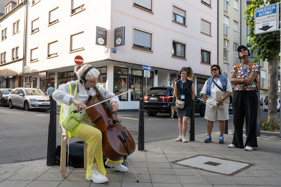 Der Spaziergang führt uns zu historischen und aktuellen Exil-Orten in der Stadt. In der Mannheimer Ausgabe treffen wir auf die nicht-binäre Komponist*in Alina Anufrienko als Guide, die Russland nach dessen Einmarsch in die Ukraine verlassen hat.