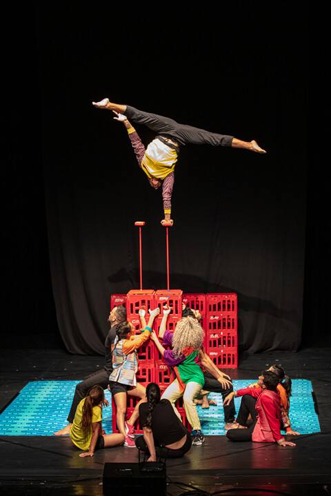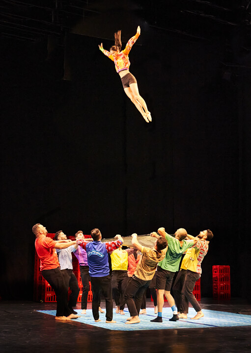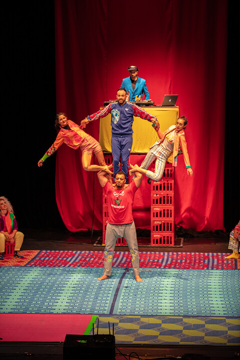 100 Cola-Kisten, ein menschliches Trampolin, ein Motorrad und viele Fußbälle – das sind die Elemente von »FIQ!«, der neuen Kreation der renommierten Groupe Acrobatique de Tanger. Einer Truppe von fünfzehn jungen Künstler*innen mit ganz unterschiedlichen Hintergründen: marokkanische Akrobat*innen, Tänzer*innen, Freestyle-Fußballer*innen, Taekwondo-Kämpfer*innen. Sie sprechen Arabisch, Französisch, Englisch, Spanisch und vor allem Akrobatisch.