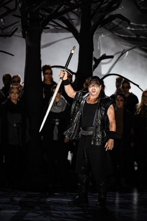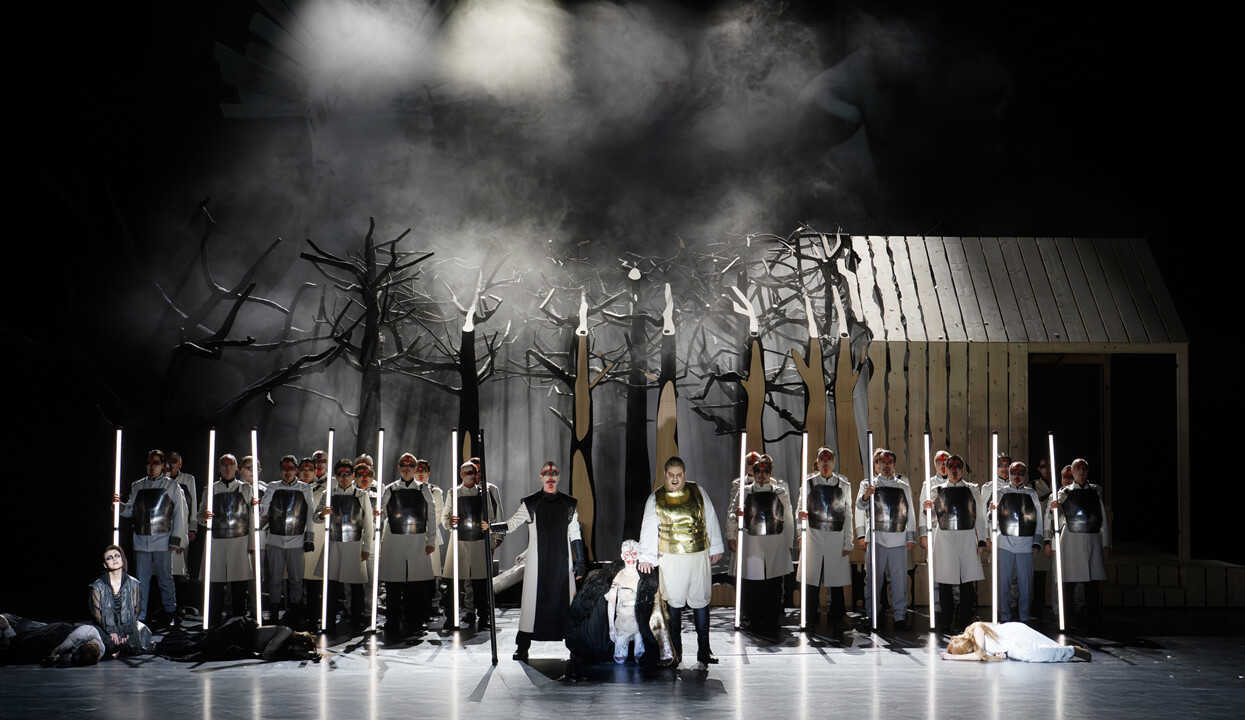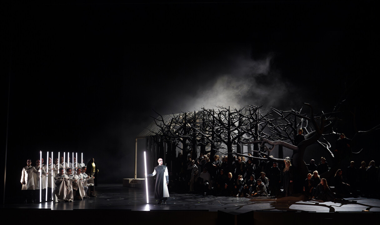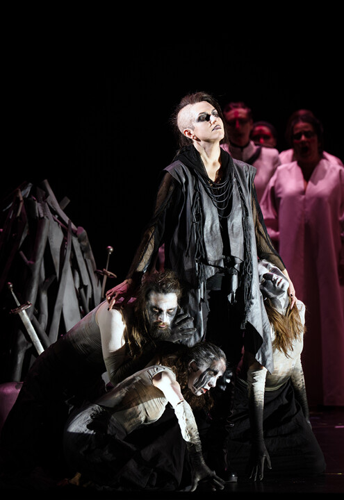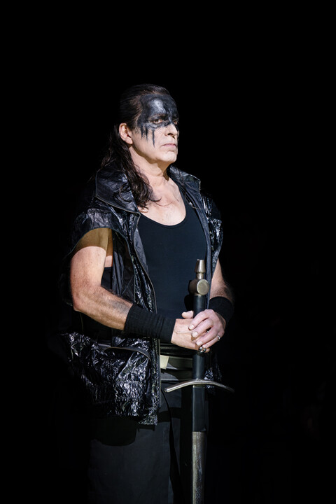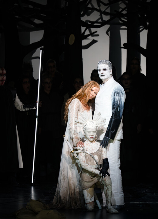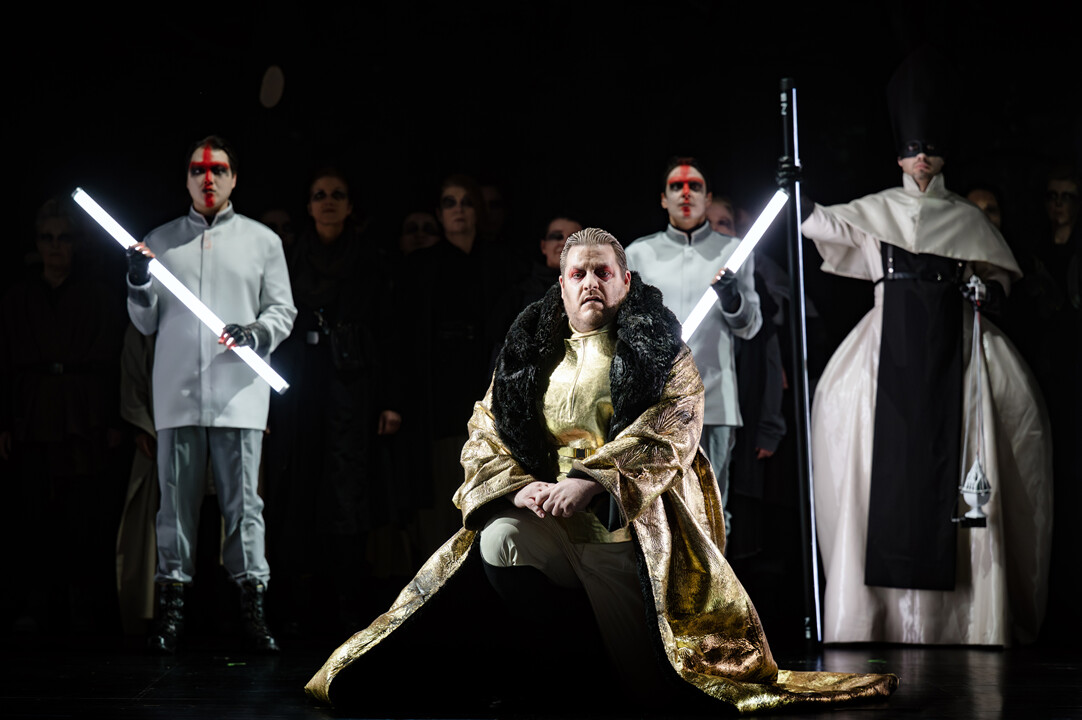 Die Inszenierung lebt in Fabian Wendlings Bühnenbild aber vor allem vom Schwarz-Weiß-Kontrast, in dem die christlichen Heerscharen König Heinrichs mit Lichtschwertern ausgerüstet sind und in der düsteren Gegenwelt Dämonen spuken, vier tanzenden Begleiterscheinungen von Julia Faylenbogens furioser Ortrud und dem gestochen scharf artikulierenden Telramund des Joachim Goltz.