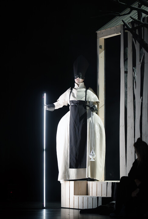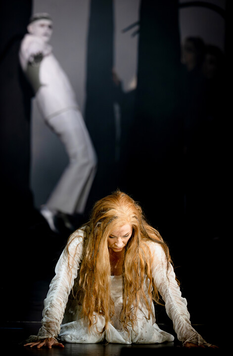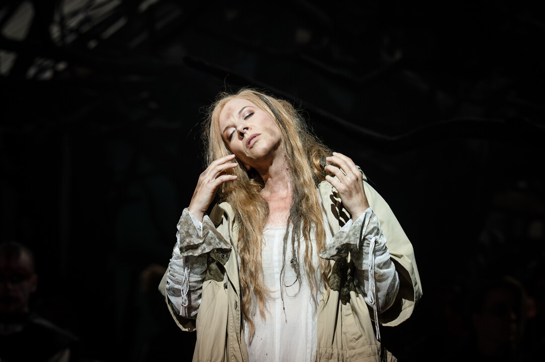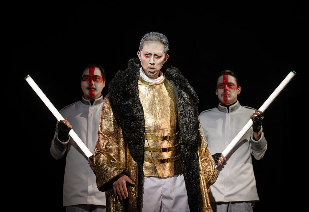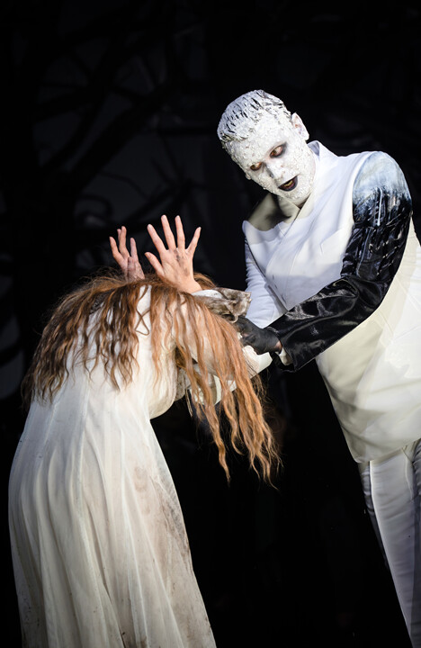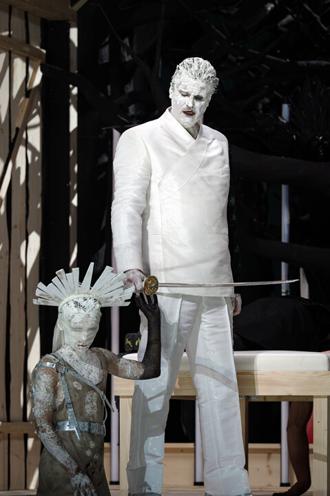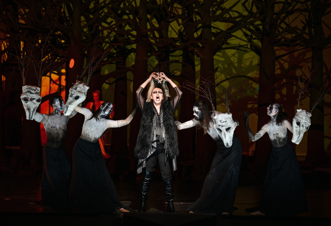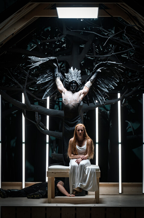 Die Inszenierung lebt in Fabian Wendlings Bühnenbild aber vor allem vom Schwarz-Weiß-Kontrast, in dem die christlichen Heerscharen König Heinrichs mit Lichtschwertern ausgerüstet sind und in der düsteren Gegenwelt Dämonen spuken, vier tanzenden Begleiterscheinungen von Julia Faylenbogens furioser Ortrud und dem gestochen scharf artikulierenden Telramund des Joachim Goltz.