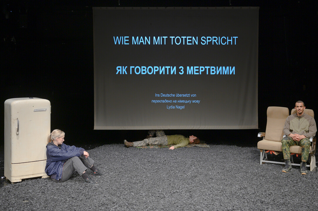 У своїй п'єсі »Як говорити з мертвими« наша постійна авторка – українська драматургиня Анастасія Косодій розповідає про численні трагедії війни та про надію, яка вмирає останньою. П'єса йде німецькою та українською мовами, і для кожної мови є субтитри.
